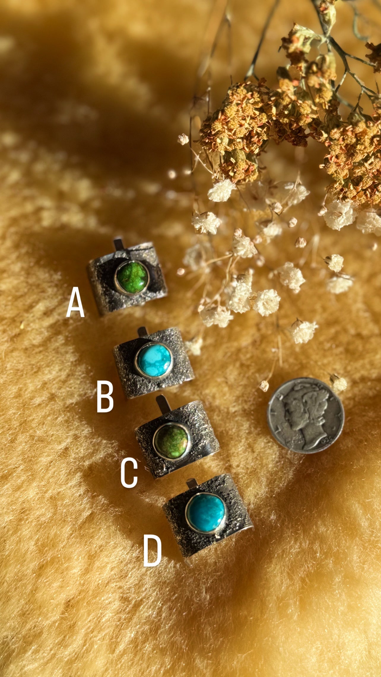 These mini braid bands sport a 8mm, circular, blue ridge turquoise cab OR a Green tear drop Sonoran Gold Turquoise cab